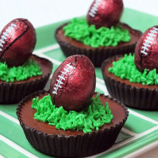 Fun peanut butter cups, topped with a chocolate football for the win! This sweet and salty snack looks cute and is super easy to make.