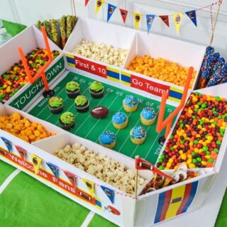 Impress your guests with a snack filled football stadium for game day. Plus, a bonus football themed pizza tutorial and stadium build link.