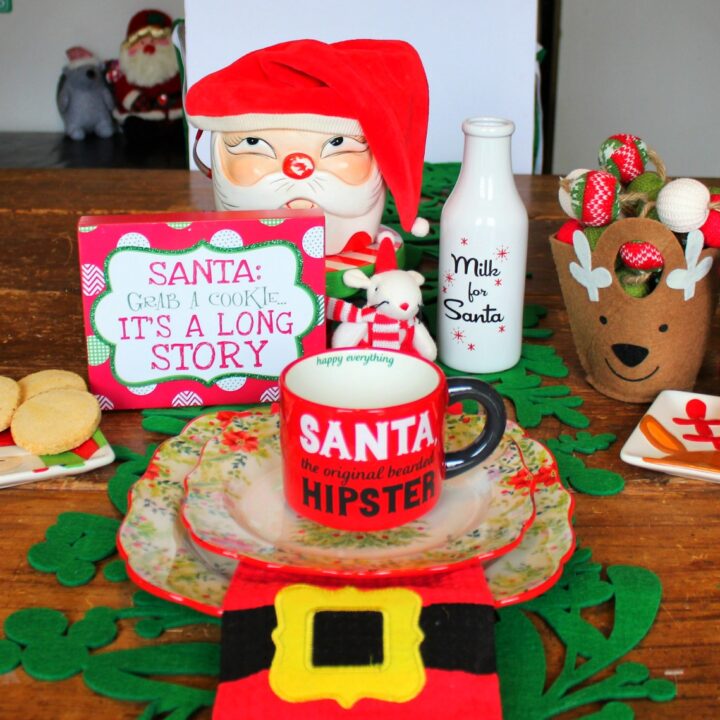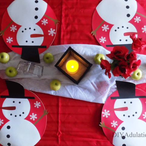 For my simple casual everyday Christmas tablescape, I chose a red tablecloth for color and added silver snowflake chargers and 2016 Target holiday plates and cups. Since I still haven’t found the perfect table runner, I used ribbon to outline a runner. The centerpiece is a gingerbread table wreath that only takes 15 minutes to make.