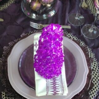 Here’s a close-up of the setting. The napkins are tied with glitter ribbon and mini pine cones. If I had to do it again, I wouldn’t use glitter ribbon as bits of glitter were flaking off onto the napkin…grr.