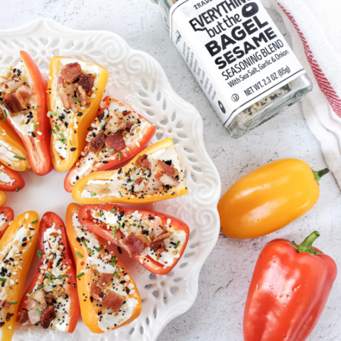 Simple and delicious and only 4 ingredients. Bell peppers with cream cheese filling and topped with bacon and Everything Bagel Seasoning is a match made in yummy heaven!