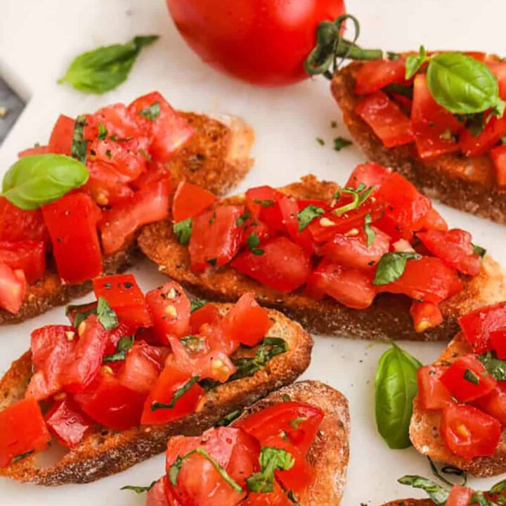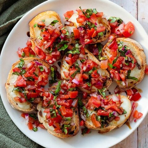 Garlic rubbed crostini and red wine vinegar-flavored tomatoes, the Classic Italian Bruschetta recipe is always a crowd-pleaser.