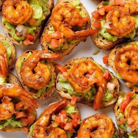 These Cajun Shrimp Crostini bites are topped with guacamole, fresh salsa, and spicy cajun shrimp. They make a delicious party finger food and come together in less than 30 minutes.