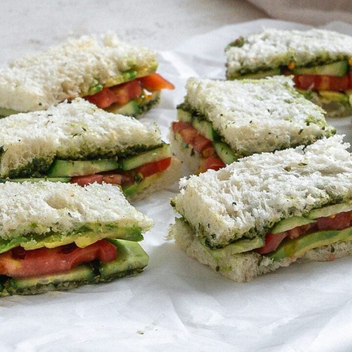 These vegan-friendly tea sandwiches require just 4 ingredients: creamy avocados, crisp cucumber, savory pesto, and white bread.