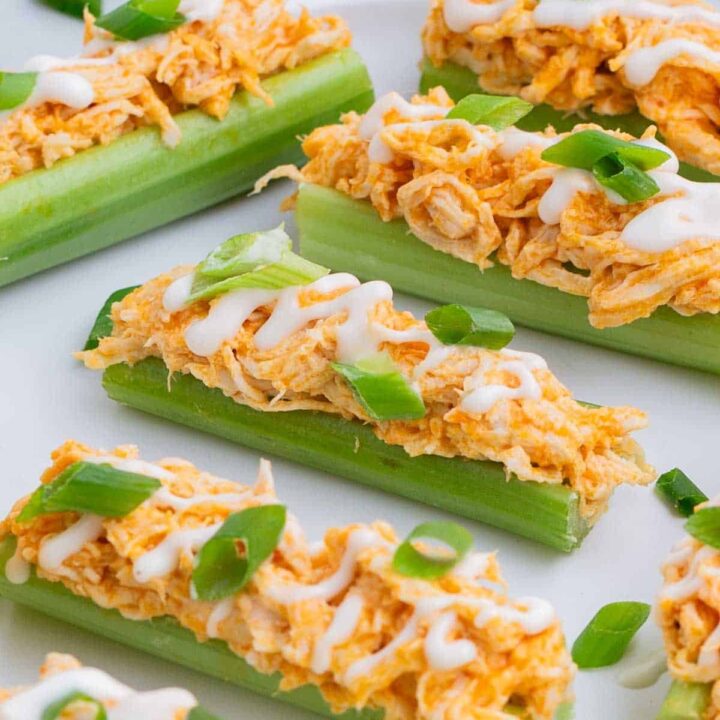 Buffalo Chicken Celery Sticks are loaded up with spicy buffalo chicken and then drizzled with ranch dressing. These cute bite-sized appetizers are so quick and easy to prep ahead of the party.