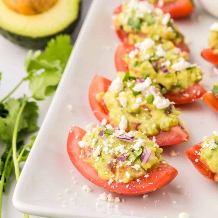 Instead of tortilla chips, this appetizer places fresh guacamole on sliced tomatoes for a burst of fresh flavors.