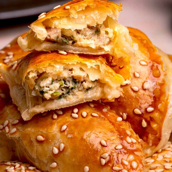 Chinese dumpling filling and puff pastry create a fusion of taste and textures, making a delightful party finger food.