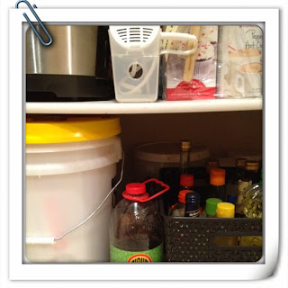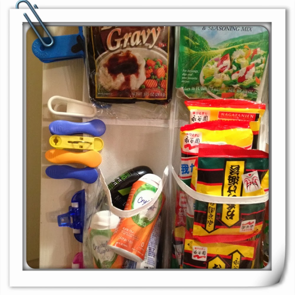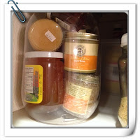 Here are some pictures of items I grouped together. I placed fruit jellies and butters in a clear container (Container is a recycled bulk snack bottle). Asian dry goods in a large basket from Target. For my daughters that love eating salads, I placed salad toppings together (Container is a Tupperware container I wasn’t using).