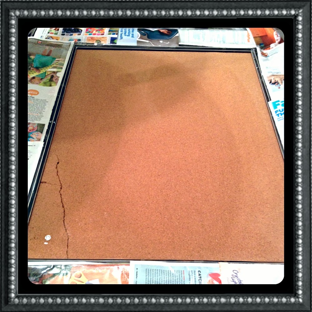 Now that I had my wall arrangement sorted out, I was able to move onto making over the wall accessories. My bulletin board had a large tear in it 🙁 Since it was going to be in a visible area, it needed to be covered with some fabric. Unfortunately, I could not remove the bulletin board from the frame and had to tape it off. Once the entire frame was taped off,  I sprayed adhesive on the cork and secured my fabric onto it.