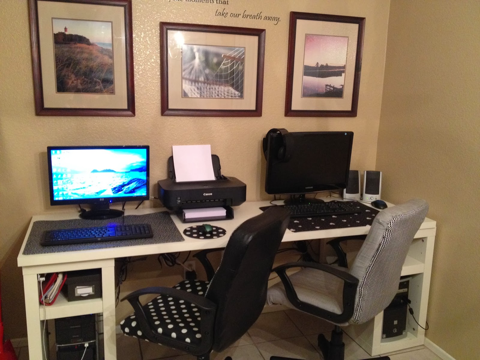 This picture shows the transformation halfway through. I had already covered the clear plastic desk mats, mouse pad, and chairs with fabric.