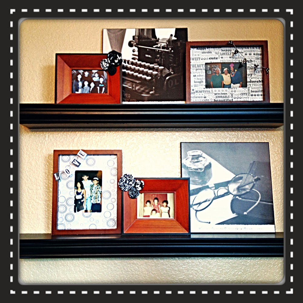 Close-up of shelves and picture frame makeovers. There are mini buntings and fabric flowers added to the frames.