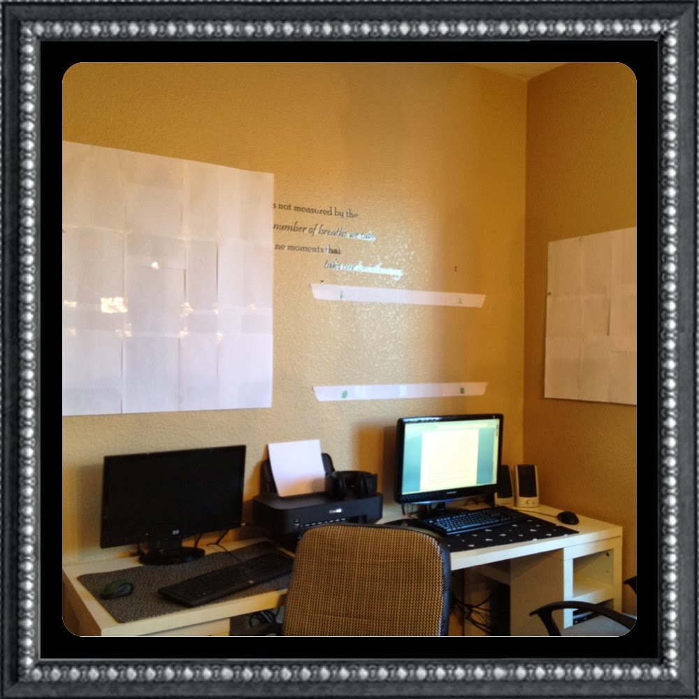 The brown pictures came down and a template of the office bulletin board and some shelves that I never hung went up onto the wall. I was able to rearrange the templates until I found an arrangement I liked.