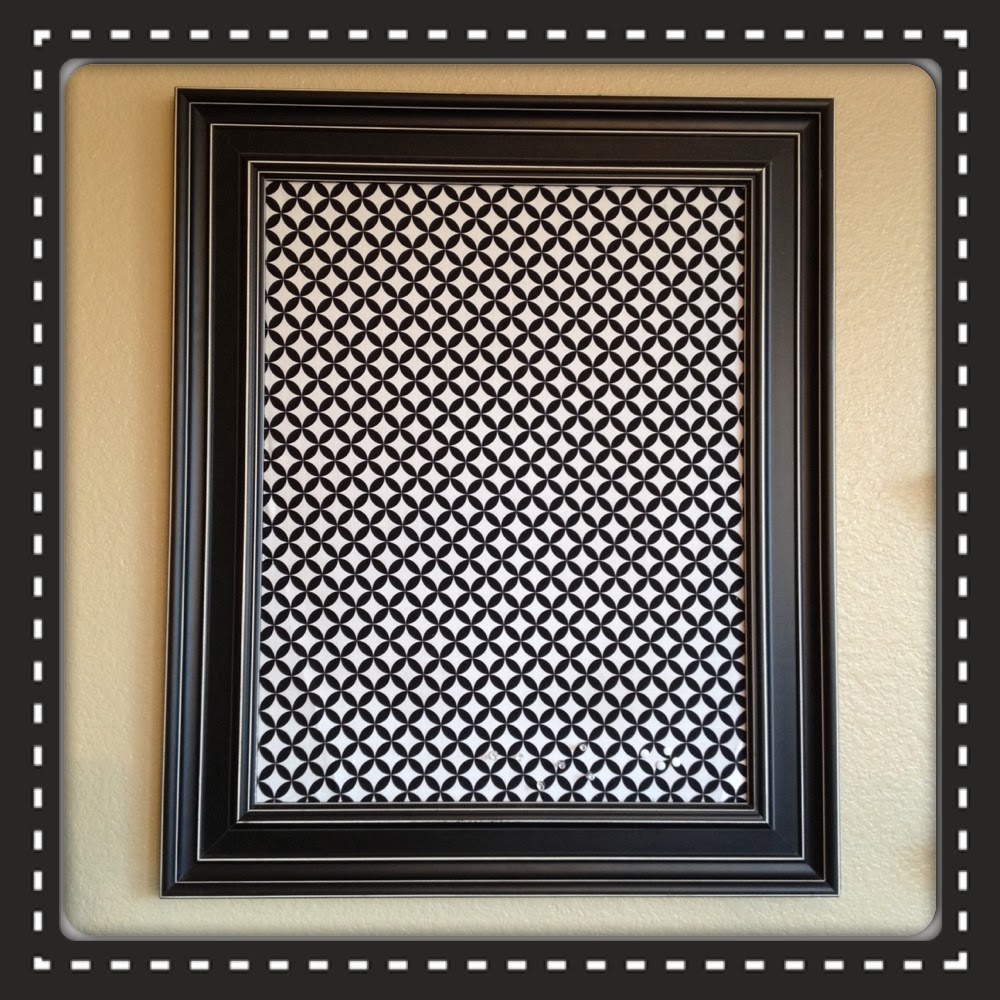 Now that I had my wall arrangement sorted out, I was able to move onto making over the wall accessories. My bulletin board had a large tear in it 🙁 Since it was going to be in a visible area, it needed to be covered with some fabric. Unfortunately, I could not remove the bulletin board from the frame and had to tape it off. Once the entire frame was taped off, I sprayed adhesive on the cork and secured my fabric onto it.