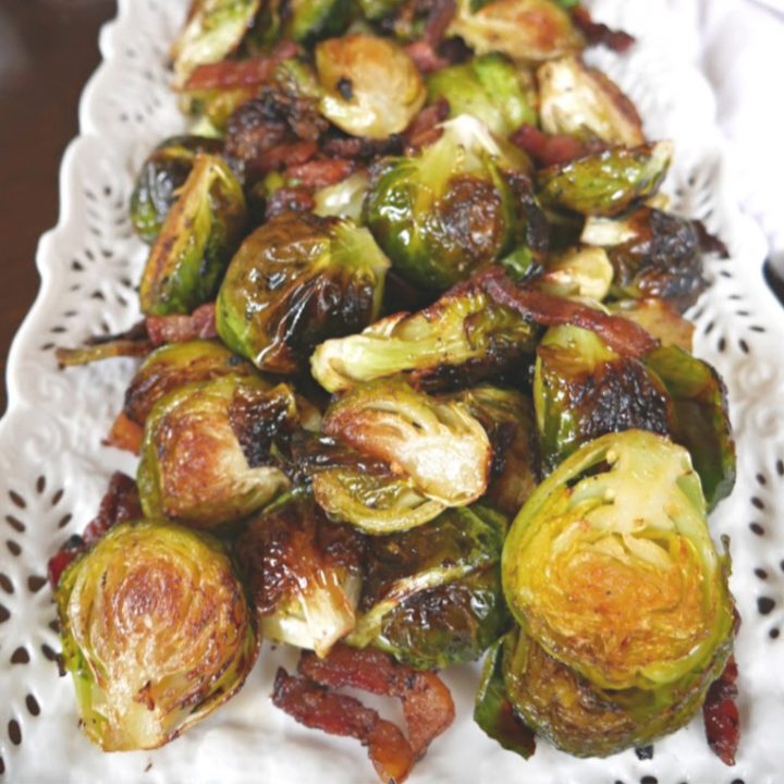 Delicious and simple to make oven roasted Brussels Sprouts with bacon and balsamic vinegar.