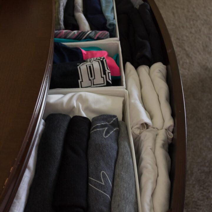 For the entire month of April, 10 bloggers shared the process of cleaning and organizing drawers around our homes. This is the final week of the Drawer Organization Blog Hop and we’re ending our drawer organization month in the bedroom. So today, I’m sharing my roll folding dresser drawer organization method.